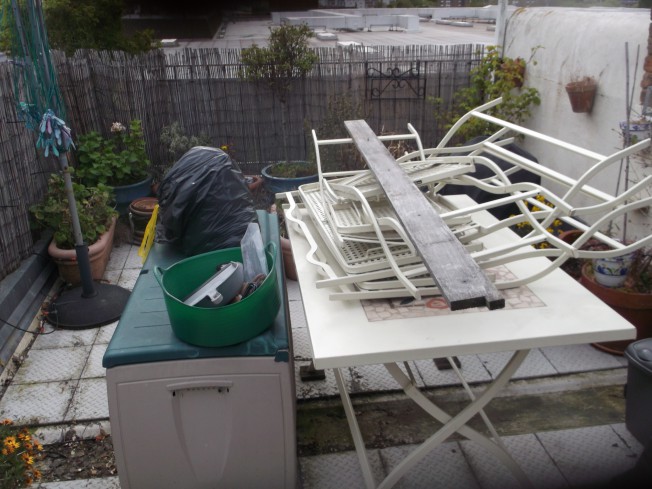 At tea-time, Gideon (see previous post) kindly comes round to help me make a start on sorting out my roof-deck, still in stricken winter mode. I have to get it sorted soon, if I want somewhere worth coming back to convalesce after the op. We sweep up rubbish, cut out dead growth, give the good stuff a quick trim where appropriate, rake the topsoil and start shifting tubs from their winter defensive positions back to summer stations. It looks so much better after an hour. We’ve accomplished a lot, but Gid has to go. Paradoxically, I’m relieved. Even with him doing most of the work, I’m knackered.